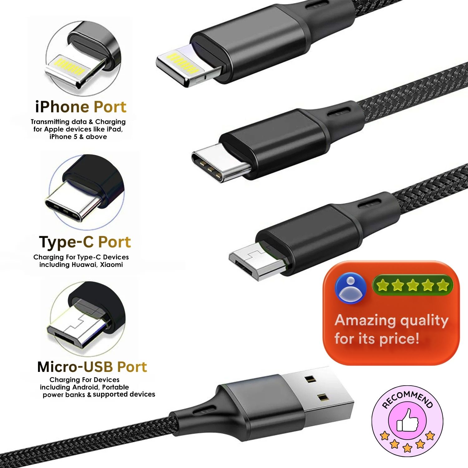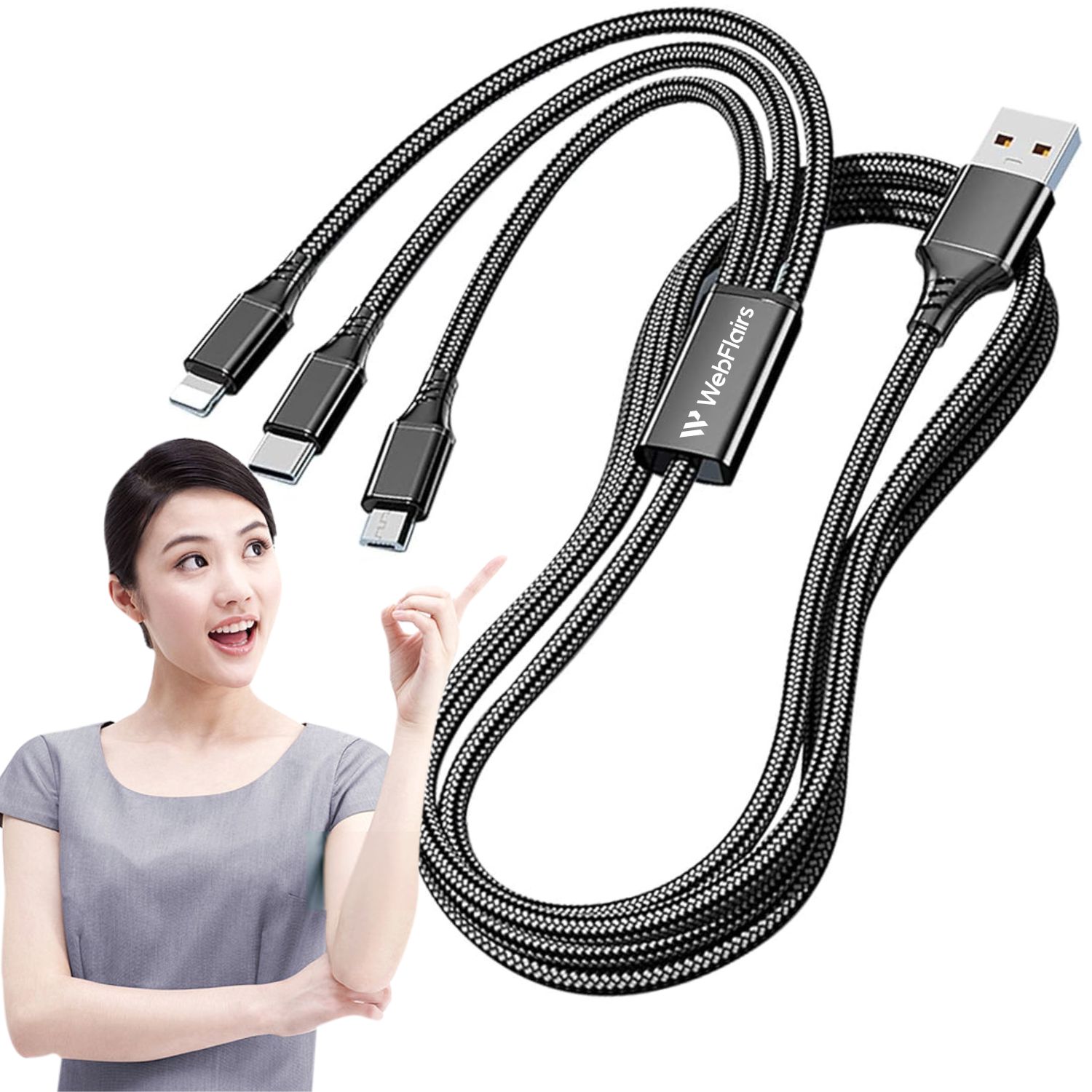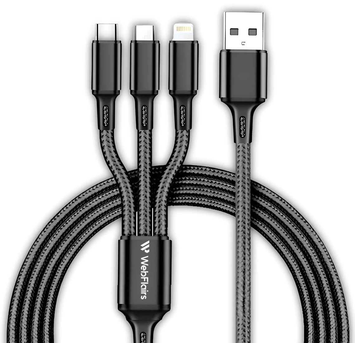 Presenting 3-in-1 nylon braided fast charging data cable by WebFlairs, having Type-C, Micro USB, and Lightning (V8) port with high strength metal alloy build quality equipped in metal heads. Find the following features mentioned below:
